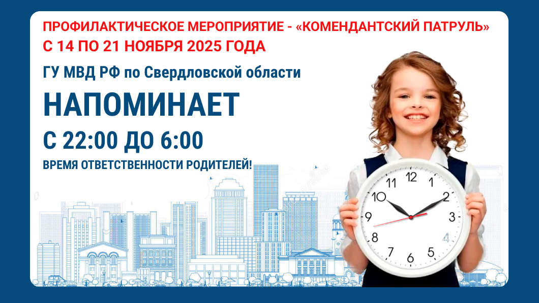 Уважаемые родители, в период с 14 по 21 ноября 2025 года на территории Свердловской области проходит оперативно-профилактическое мероприятие «Комендантский патруль».